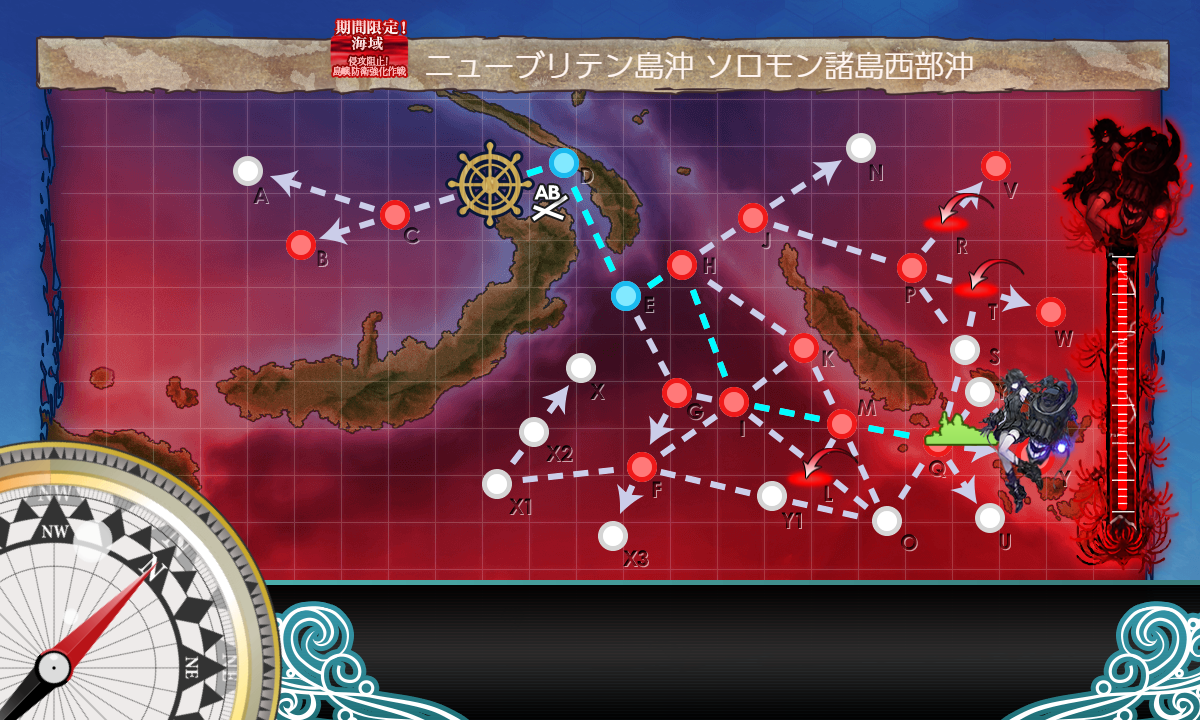 第三ボスマス開放後は機動連合だと殆どZマス方向に逸れてしまうため、水上連合での攻略が必要となる。幸いギミックで要求されるボスマス(X・Yマス)の戦果は全てA勝利以上のため、S勝利を気にする必要はない。